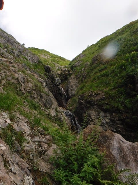 大滝1段目は水流左壁の易しいところをサクサク進む.2段目は水流沿いを試みるが途中から処理に時間がかかりそうな気配が漂うため,左の草と灌木の際をつないで登る.3段目?はそれまでに比べかなり傾斜も緩くなり容易に上へ.