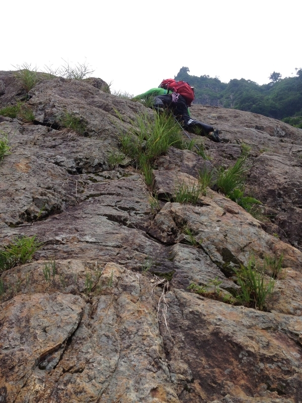 ただし、残置支点は全くなく所々灌木が生えているだけです。登っていくと天候も良くなり下を見下ろすと素晴らしい景観です。気持ちいいですな。